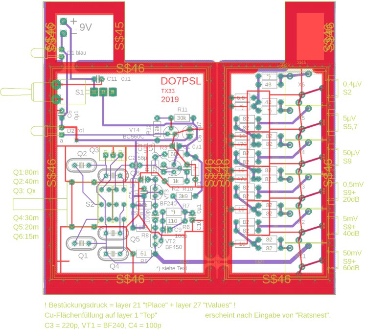 Mit diesem kalibrierten HF Generator können Transceiver (TRX), KW-Empfänger geprüft werden. Geprüft wird die Empfindlichkeit, Verstärkungsregelung und Skalenverlauf des S-Meter. Der HF Generator wird mit einer 9V Blockbatterie betrieben und ist somit auch für den mobilen Einsatz geeignet. Die Platine passt in ein 100x100mm Fischer-Gehäuse. Der HF Generatur ist in gut 60Min. aufgebaut.
